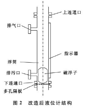 (3)方案3。改造現有的液位計,采用上下端日連接,上過程進日改為排氣口,下過程進日改為排污口,原安裝浮子法鑄和排氣閥接日改為連通日,在下部增加一個多孔隔板,保證浮子不進人工藝管線,同時保證液體的正常流動。在保證不改變液位計結構情況下,將液位計與工藝管線連接。此方案優點是花費少,不閑置設備,并且還能達到液位計與管線清理同步,實現維修與檢修同步。